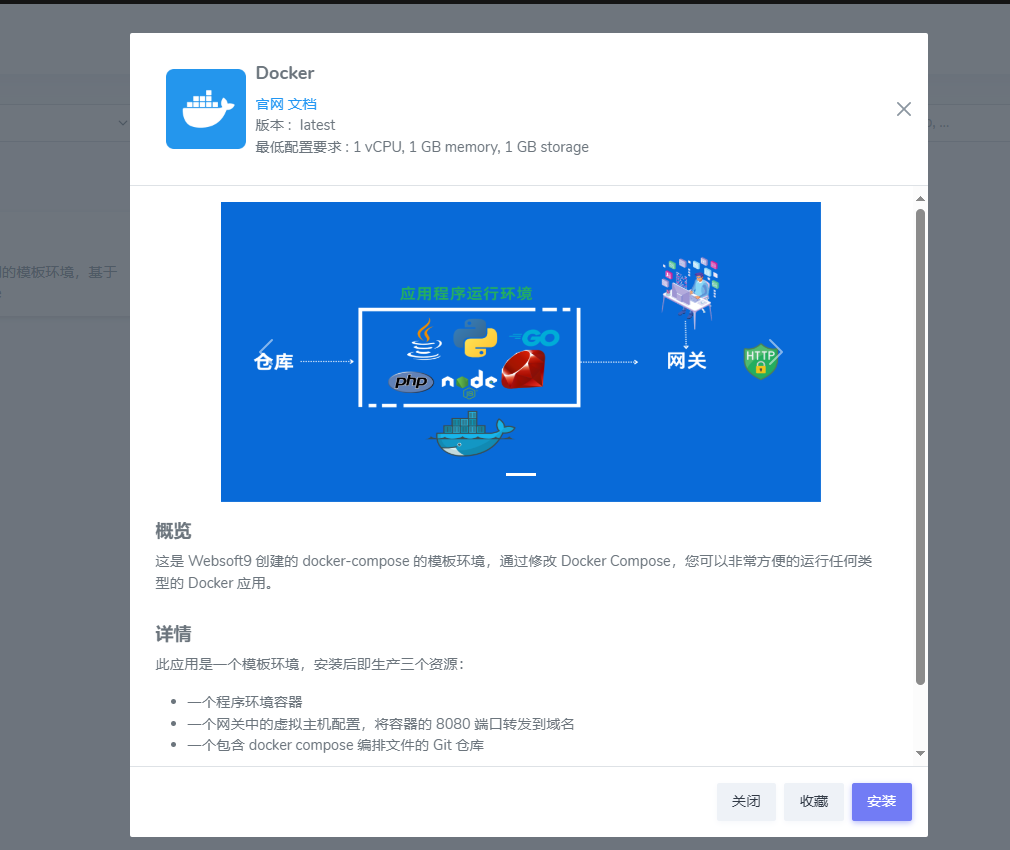 1. Websoft9 应用商店 中进入 "运行环境" 下的 "Docker" 子类